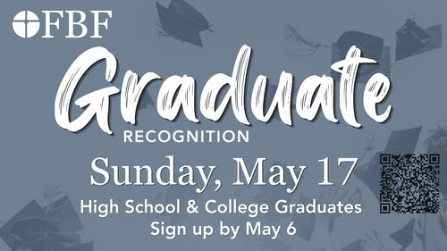 High School and College graduates sign up for Graduate Recognition by May 6. Recognition will be Sunday, May 17 at the conclusion of the 10:30 a.m. service.